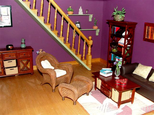 Vista del salón. Me gusta el aspecto que va adquiriendo esta parte de la casa. La alfombra ¡¡que me encanta...! se la compré a Mati ( minisparacasitas.es.tl), hace juego con las paredes del salón y es muy moderna. La mesa de centro, estantería y el aparador son de la colección lees line, el cual tiene una linea de mobiliario que me parece muy elegante. En la mesa de centro se puede ver una cajita de bombones con forma de corazón y una cajita de pastas que compré a Teresa Martinez ( http://www.tinyterminiatures.com/).